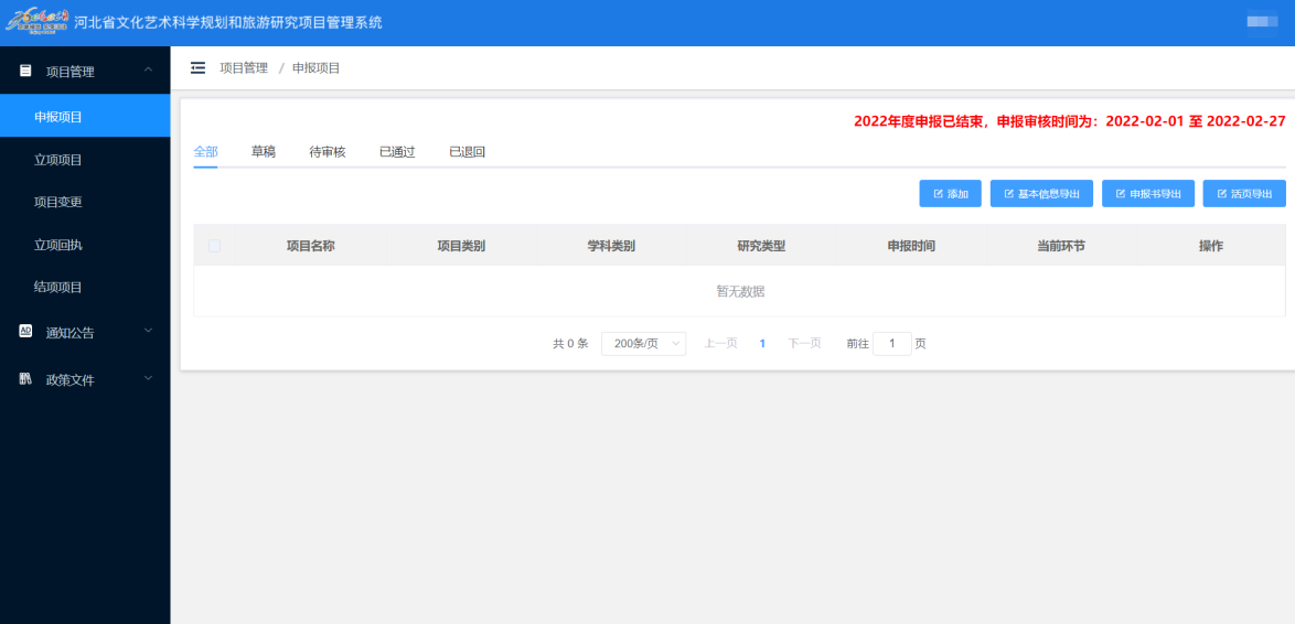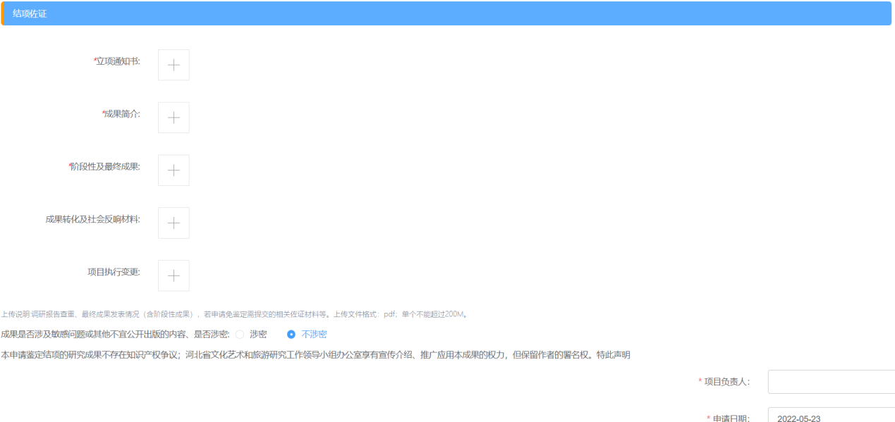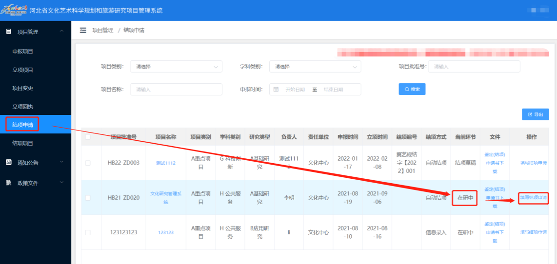 在本系统进行结项申请。请参考《河北省文化艺术科学规划和旅游研究项目管理系统使用手册(申报人角色)》