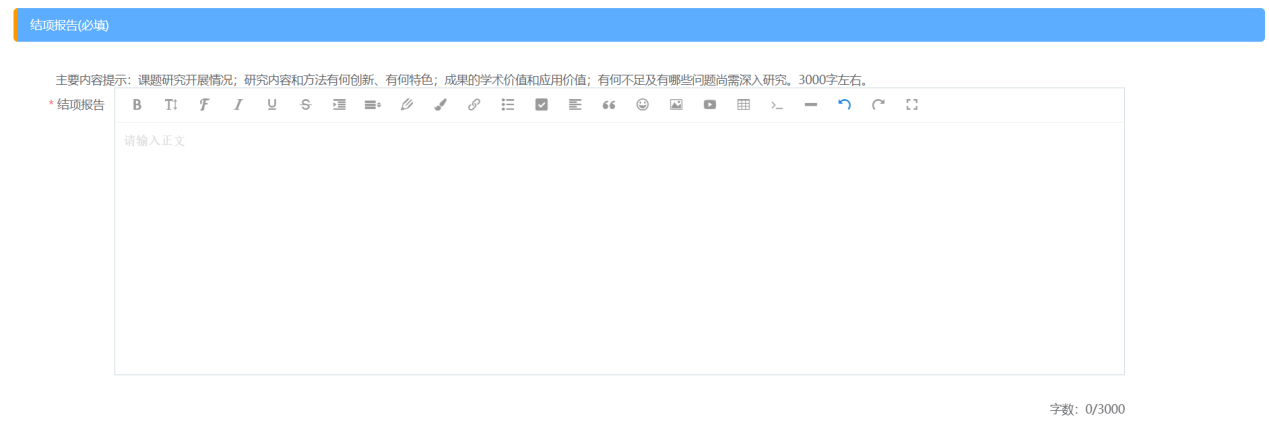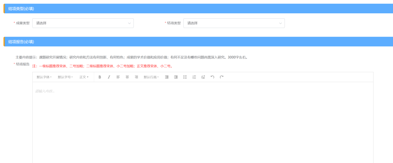 3)按照结项申请要求,将申请的项目信息资料,填入相应的输入框中。 信息输入过程中,系统将随输入及时验证输入内容的合法性,并以红色提示文字提示录入问题。