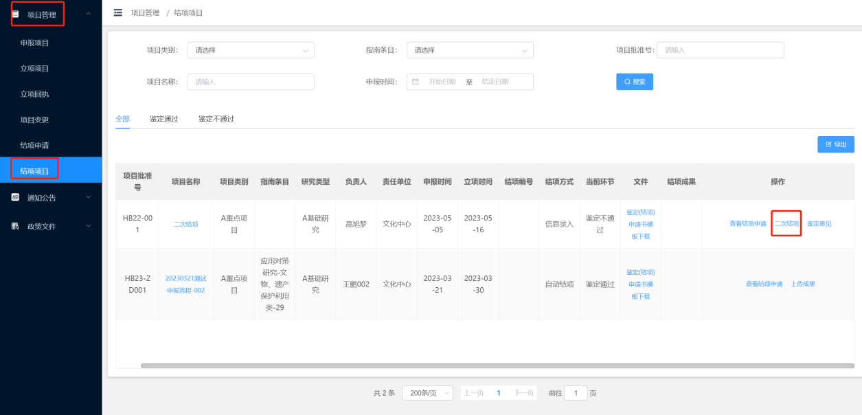 2)点击左侧功能菜单“项目管理”模块下的“结项项目”菜单,进入结项项目界面,点击“二次结项”按钮(如图5.1-1所示):