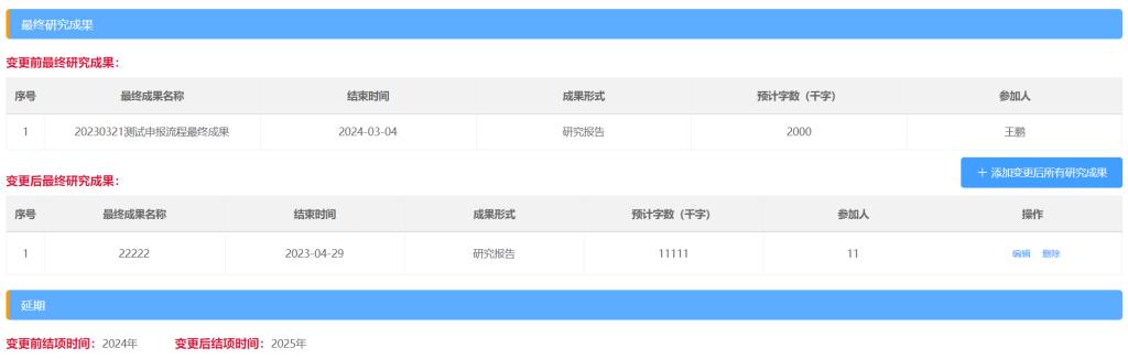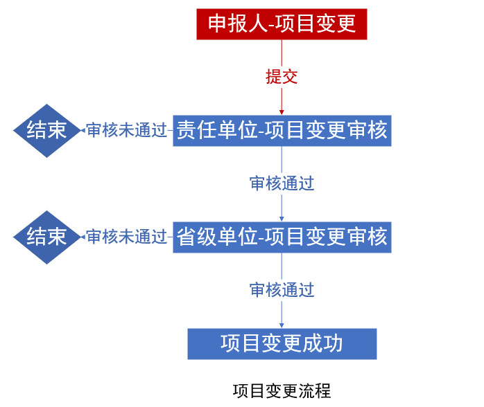 项目变更是对已经立项的项目内容进行成果形式、延期、变更课题组成员等信息的变更,流程如下图所示。
