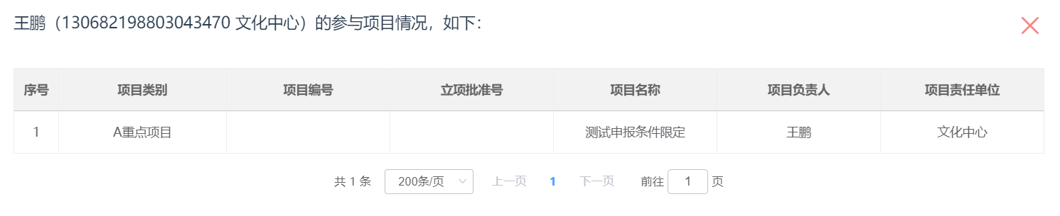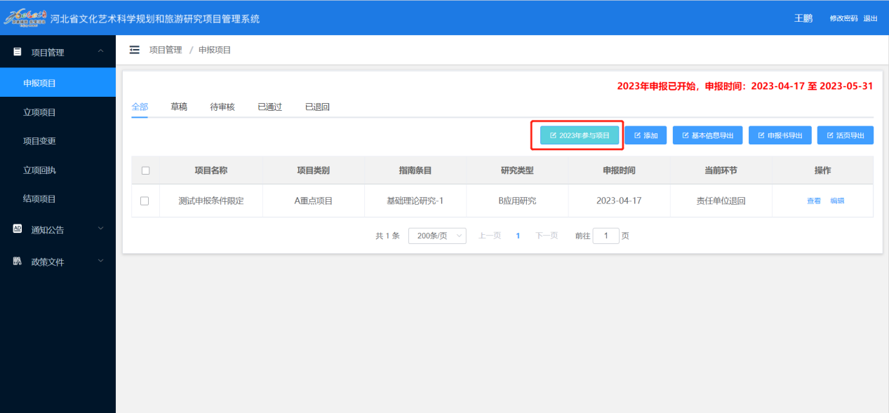 4) 点击“2023年参与项目”按钮,可以查看本年度申报和作为课题组成员参与的项目情况。