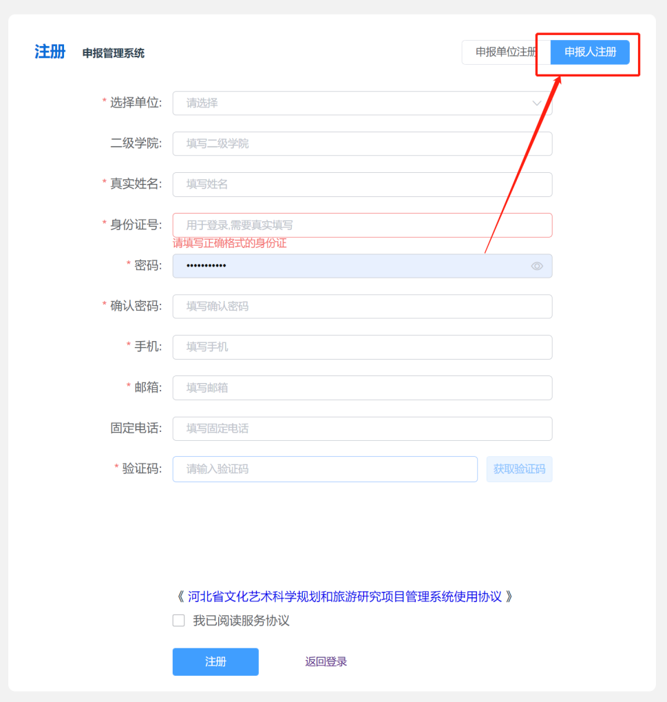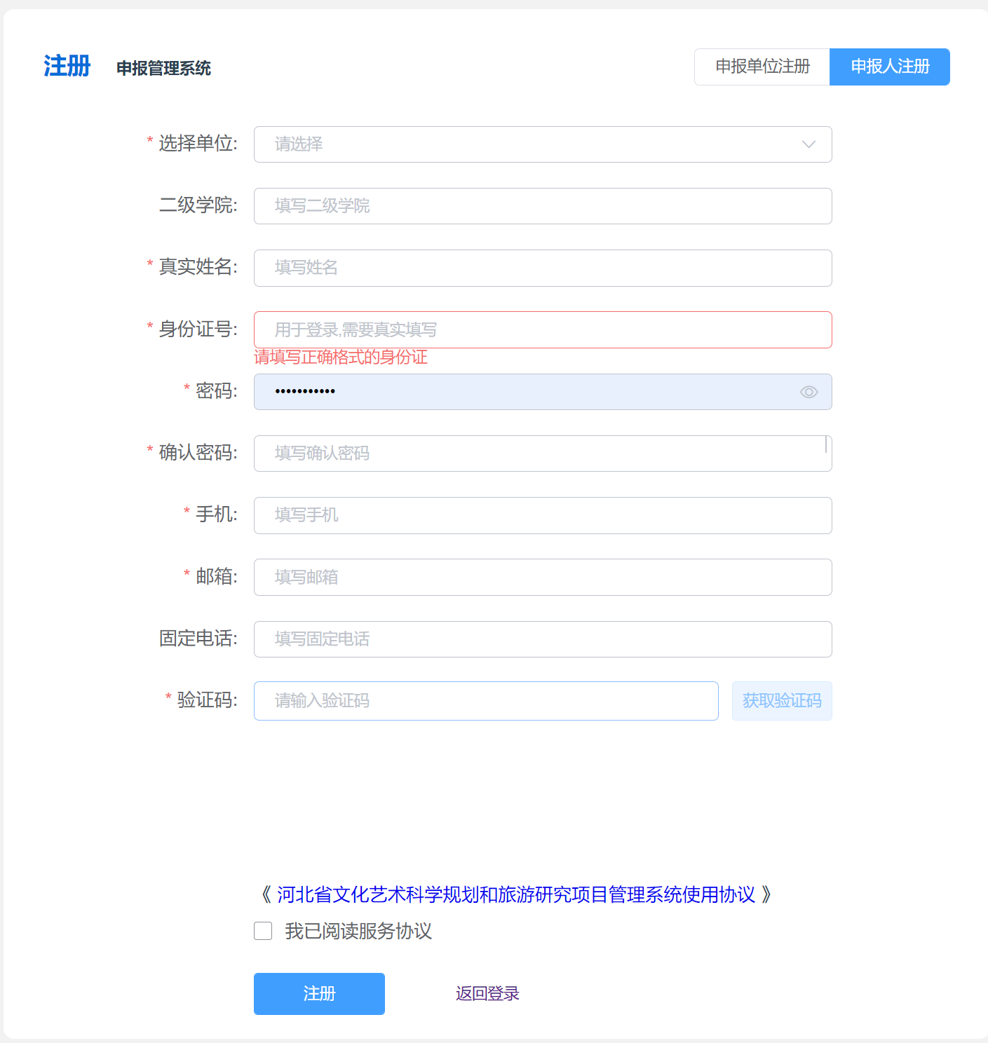 申报人通过用户注册功能,可以注册本系统的申报账号。