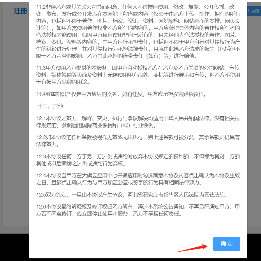 4) 确认信息无误后,点击“河北省文化艺术科技规划和旅游研究项目管理系统使用协议”按钮,进入协议界面,点击阅读协议最底部的“确定”,表示阅读同意服务协议,如下图1-4所示: