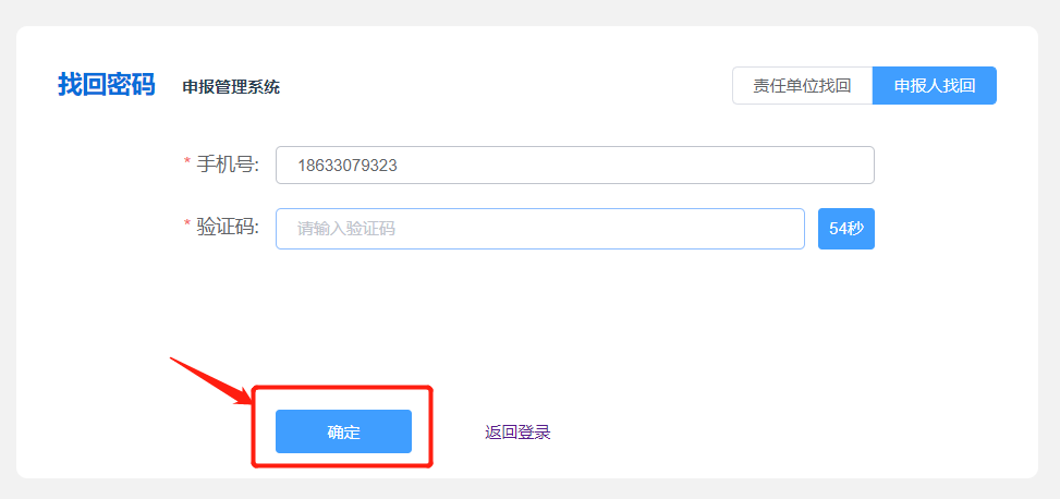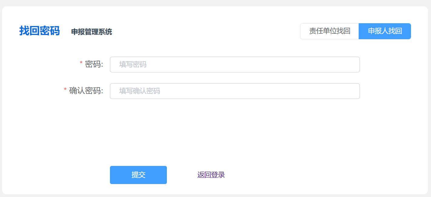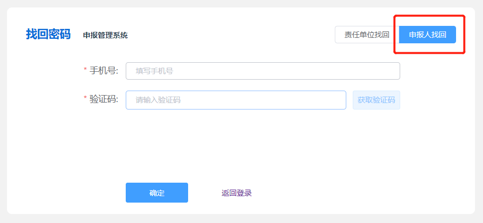 2) 进入忘记密码页面,点击右上角“申报人找回”,如下图2-5所示: