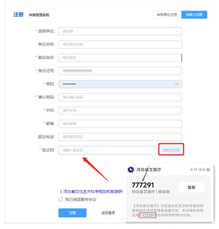 5) 点击“获取验证码”,将获取到的短信“验证码”输入框到输入框,如下图1-5所示: