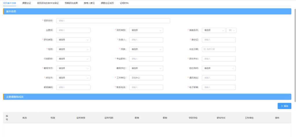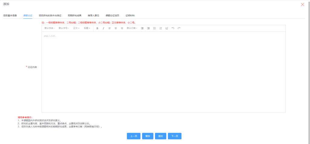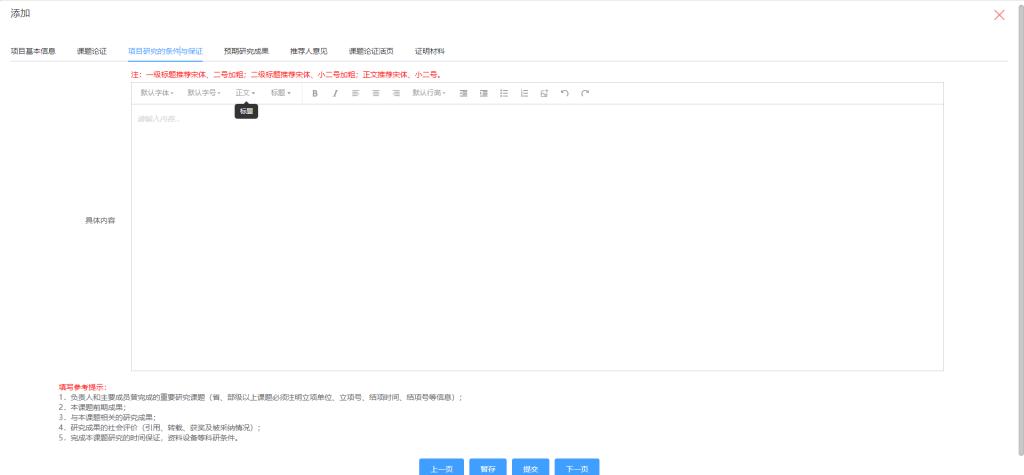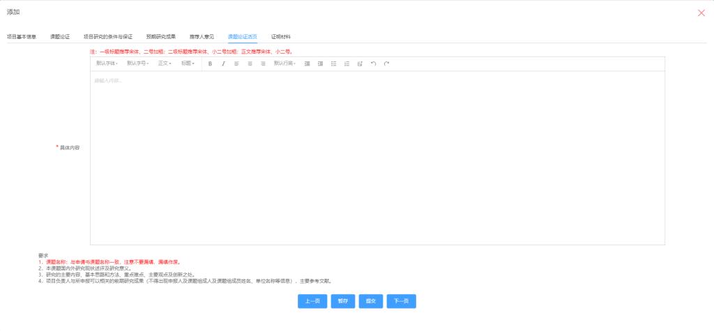 5) 按照项目申报要求,将待申报的项目信息资料,填入相应的输入框中。信息输入过程中,系统将自动检测输入内容的合法性,并以红色字体提示。