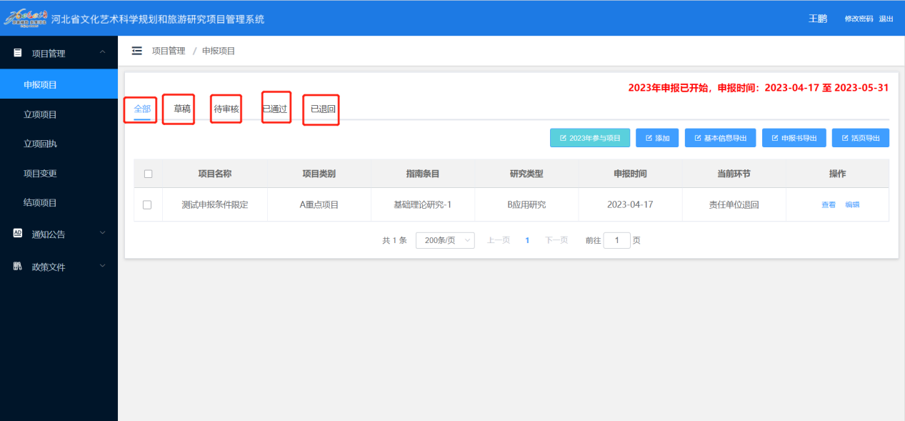 2) 点击左侧功能菜单“项目管理”模块下的“申报项目”菜单,进入申报项目界面“全部”类型下。如果项目未提交申报,则项目的状态为“草稿”,此时项目可以执行删除、编辑提交申报操作;如果项目已提交申报,则项目的状态为“待审核”,此时项目不可编辑或删除;或者根据项目的状态切换查询数据,如下图3-6所示: