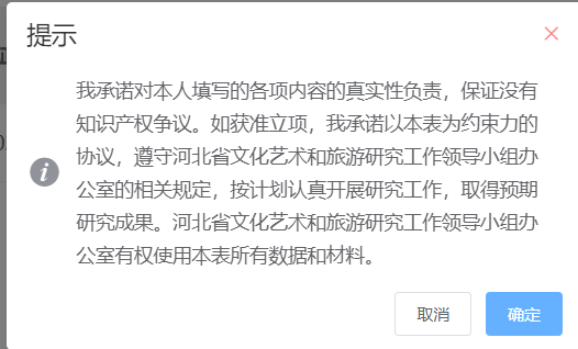 8) 阅读并同意“项目提交申请承诺”后,点击“确定”按钮,系统会将项目提交到所属单位进行审批。提交成功后,项目将不允许再进行修改。