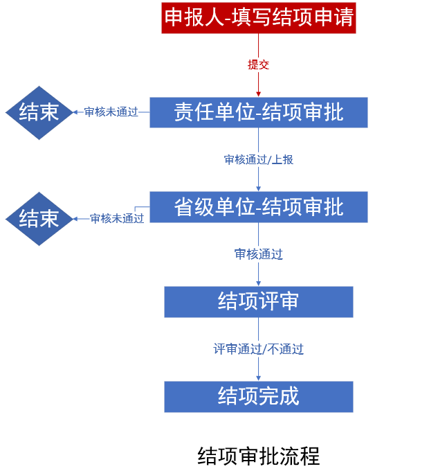 结项申请,用于当前申报人对在研项目提出结项申请,流程如下图7-1所示;