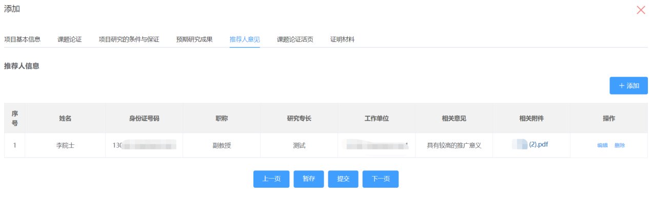 4) 申报人申报项目,点击“添加”按钮,如下图3-4所示: