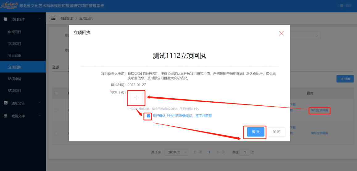 2)点击左侧功能菜单“项目管理”模块下的“立项回执”菜单,在立项回执页面选择“未提交回执”类型,选择数据点击“填写立项回执”在立项回执弹框中上传“材料文件”、勾选“我已确认上述内容准确无误,签字并盖章”后点击“提交”,即填写的立项回执提交到责任单位审核。如下图4-2所示: