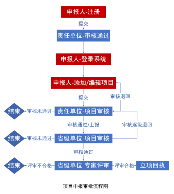 在项目申报期内,用于申报人在线填报自己负责的项目。项目申报流程,如下图3-1所示: