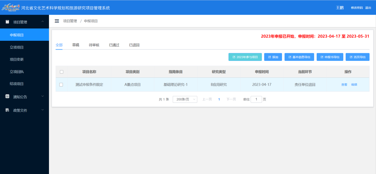 8) 点击“编辑”按钮,可以修改未上报或审批退回的项目。