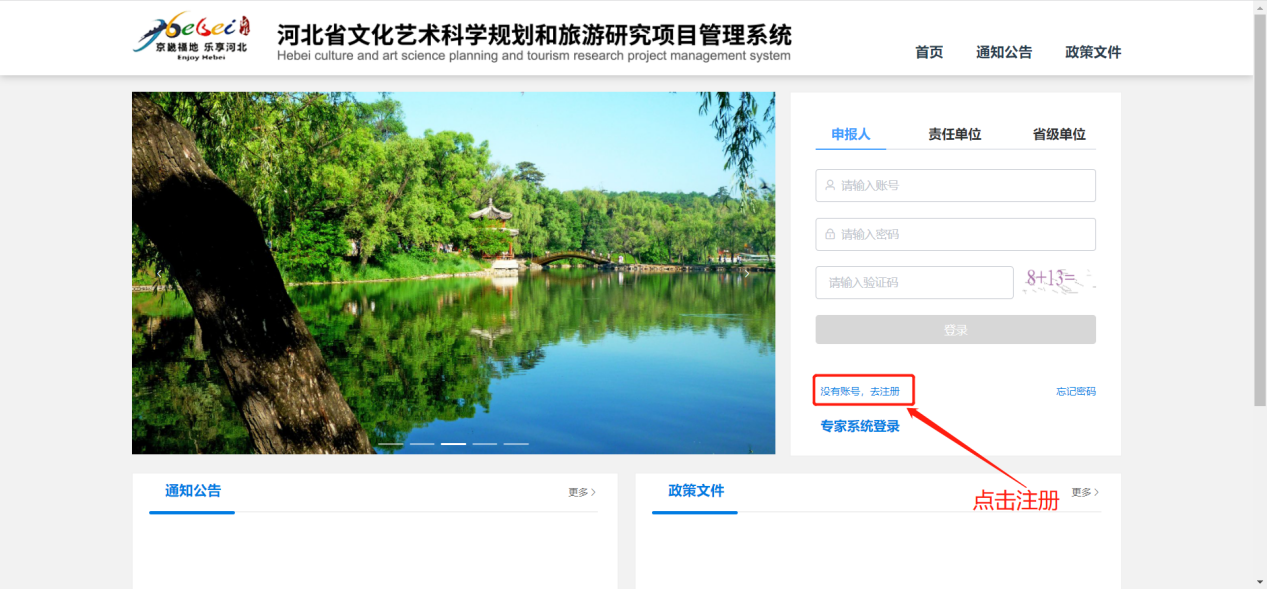 1) 打开您安装的浏览器,在浏览器地址栏输入“项目管理系统”系统网址:http://hbwlkyglxt.hebeitour.com.cn,进入系统页面。找到“没有账号,去注册”按钮,如下图1-1所示: