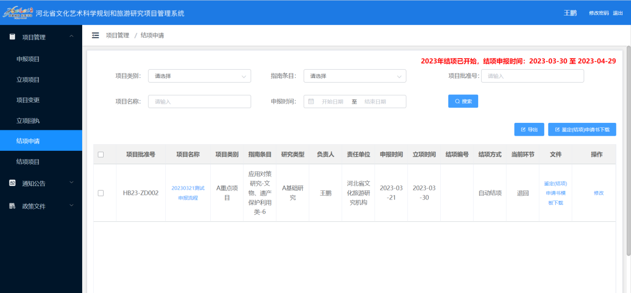 5) 点击“鉴定结项申请书下载”,可以下载鉴定结项申请书;