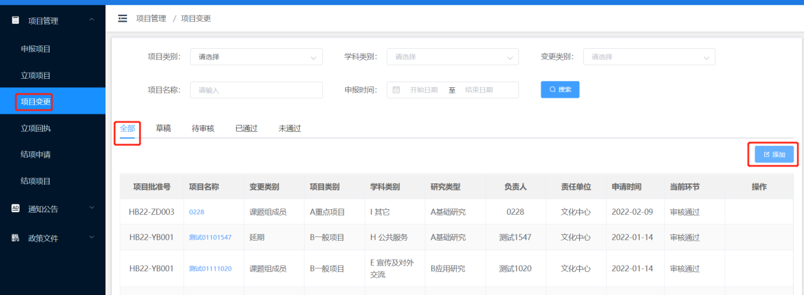 2)点击左侧功能菜单“项目管理”模块下的“项目变更”菜单,进入项目变更界面,点击“添加”按钮,如下图5-1所示: